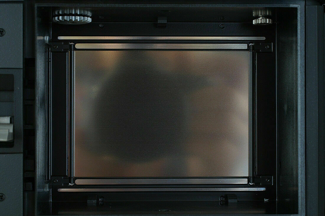 Fuji GX 680 I+II 220 Roll Film Holder 6x8 Film-Magazin + Filmeinsatz ----------------------------------------------------------------------------------------------------------------------------------------------------------------------------------------------------------------------------------------------------------------------------------------------------------------------------------------------------------------------------- Um eventuelle Zweifel von GX680-Einsteigern nicht nur mit einem einfachen "Paßt auch für 120er-Film" beseitigen zu wollen, folgen hier vom Anwender die technische Erklärung und ein praktischer Beweis "am Film". Der Film wurde natürlich in einem meiner anderen 220er- Magazine durchgezogen, damit dies Magazin bei NULL Aufnahmen bleibt. -------------------------------------------------------------------------------------------------------------------------------------------------------------------------------------------------------------------------------------------------------------------------------------------------------------------------------------------------------------------------------------------------- . Auch für 120er Film voll nutzbar. Die gefederte Andruckplatte paßt sich an 120er-Film mit Schutzpapier an. Die Kamera macht (wie mit einfachem 120er 6x8-Magazin) 9 Aufnahmen und spult dann zum Ende. Alles mit Display-Anzeigen und normalen und gleichmäßigen Bild-Abständen. (Siehe Testfilm-Streifen mit markierten Bildpositionen) ------------------------------------------------------------------------------------------------ Aus meiner umfangreichen Foto-Ausrüstung/-Sammlung NULL